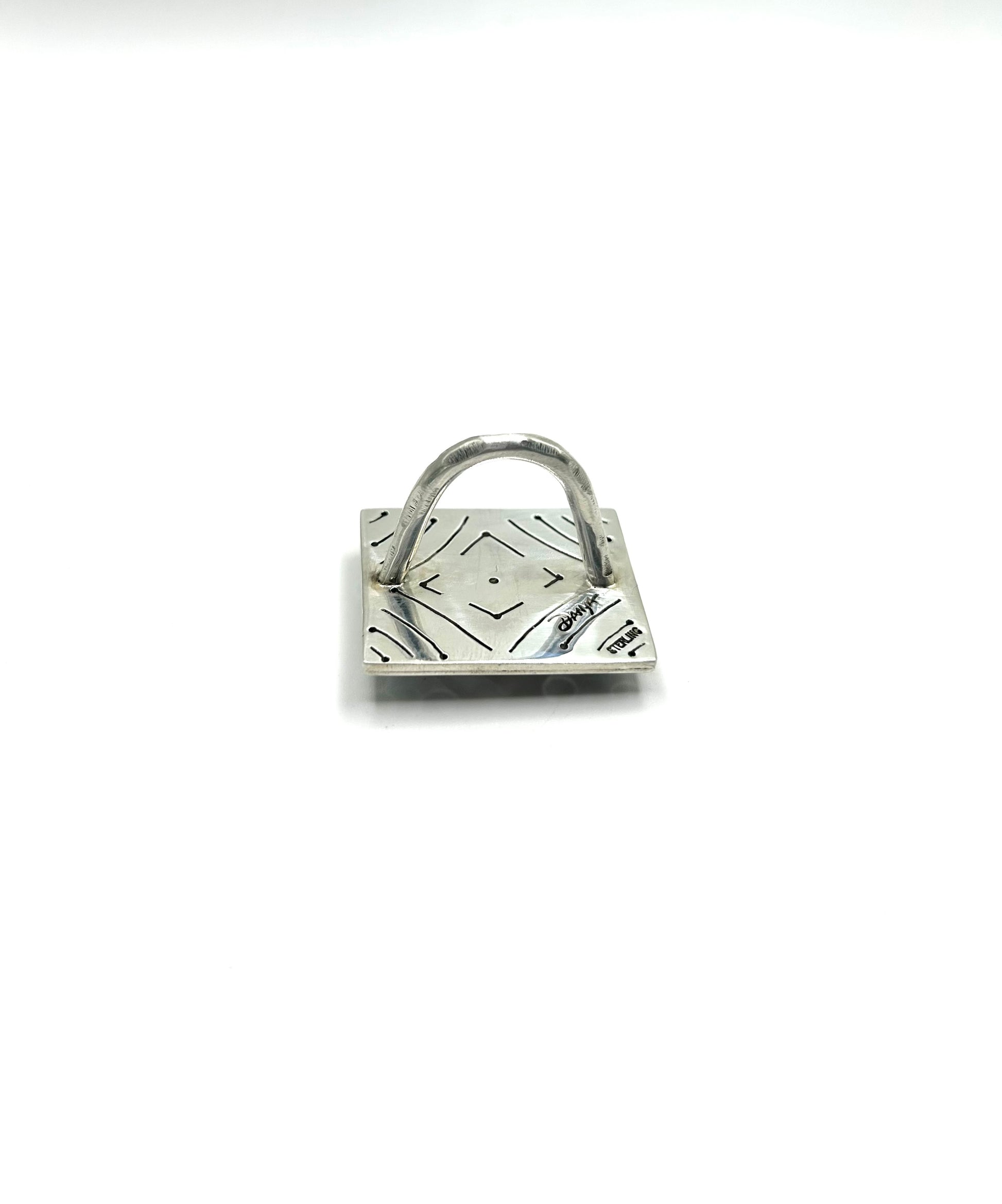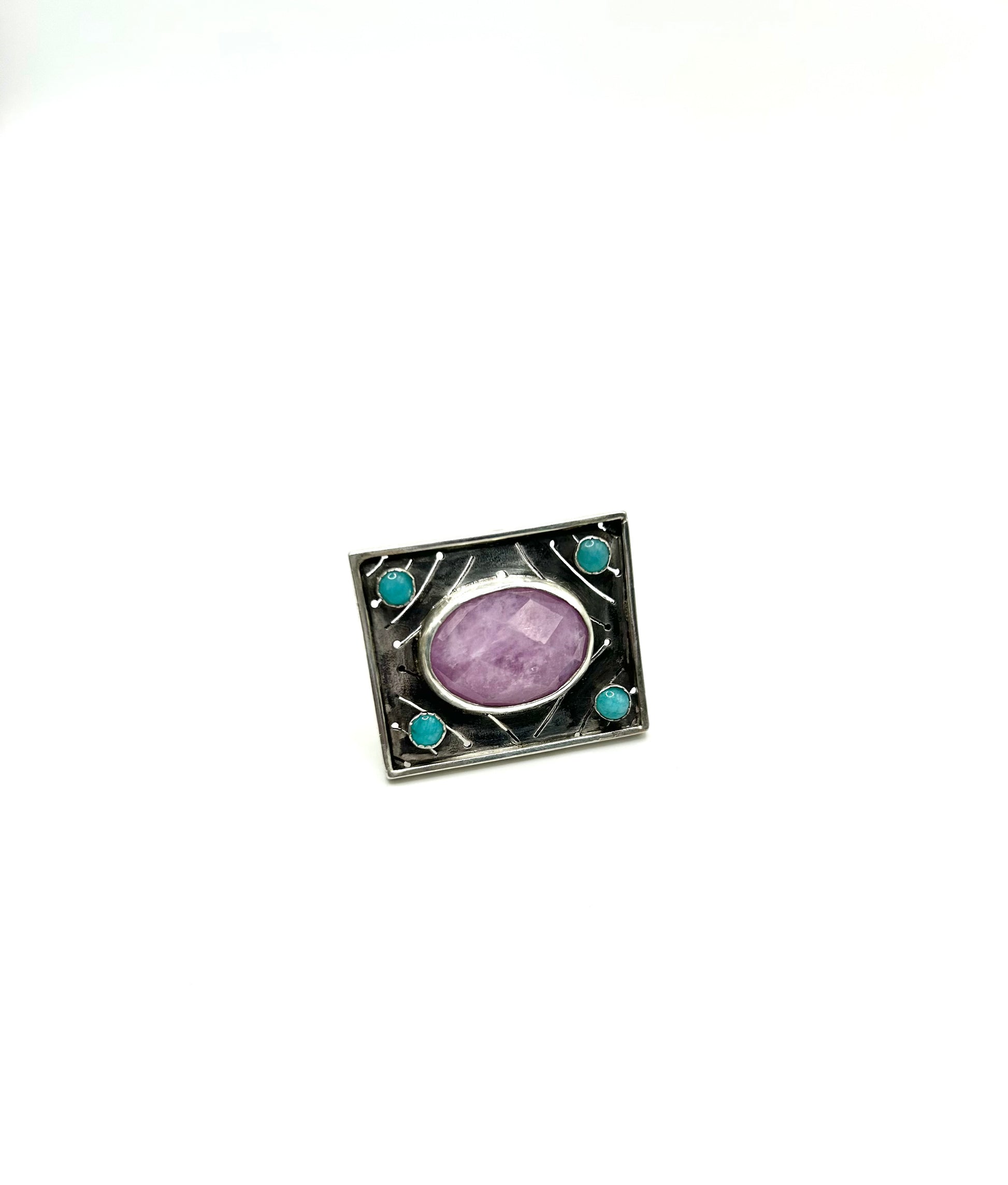 This design was inspired by an ancient stamp found in Mexico City made for stamping pottery. Delicately sawed and pierced in sterling silver and set with a beautiful rose cut Kunzite stone and 4 small amazonites. The ring shank is hand hammered in a unique u shape for a comfort fit.