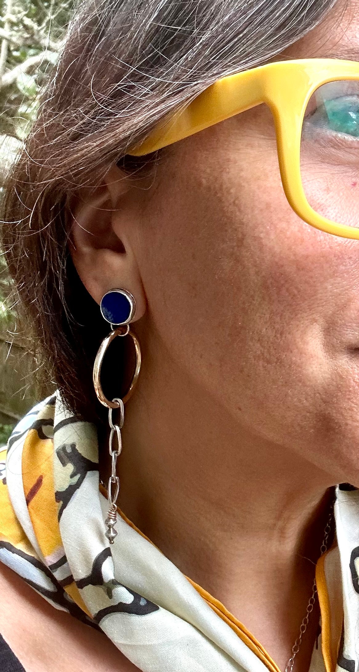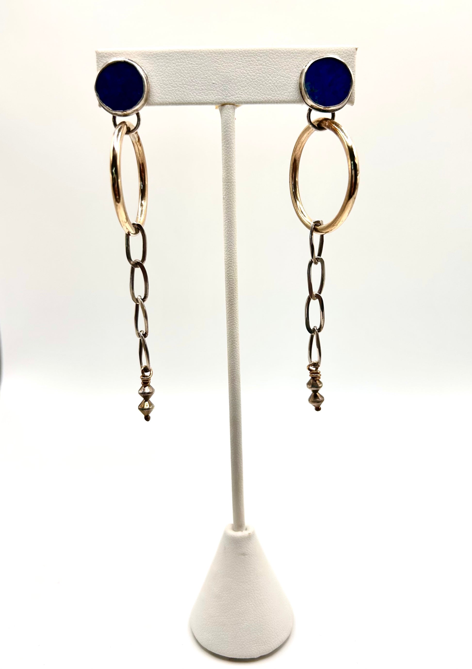 Post earrings set with genuine lapis lazuli, a gold filled loop dangle with silver chain and silver beads to give movement to a classic and elegant twist to the loop earring. Light weight for everyday wear.