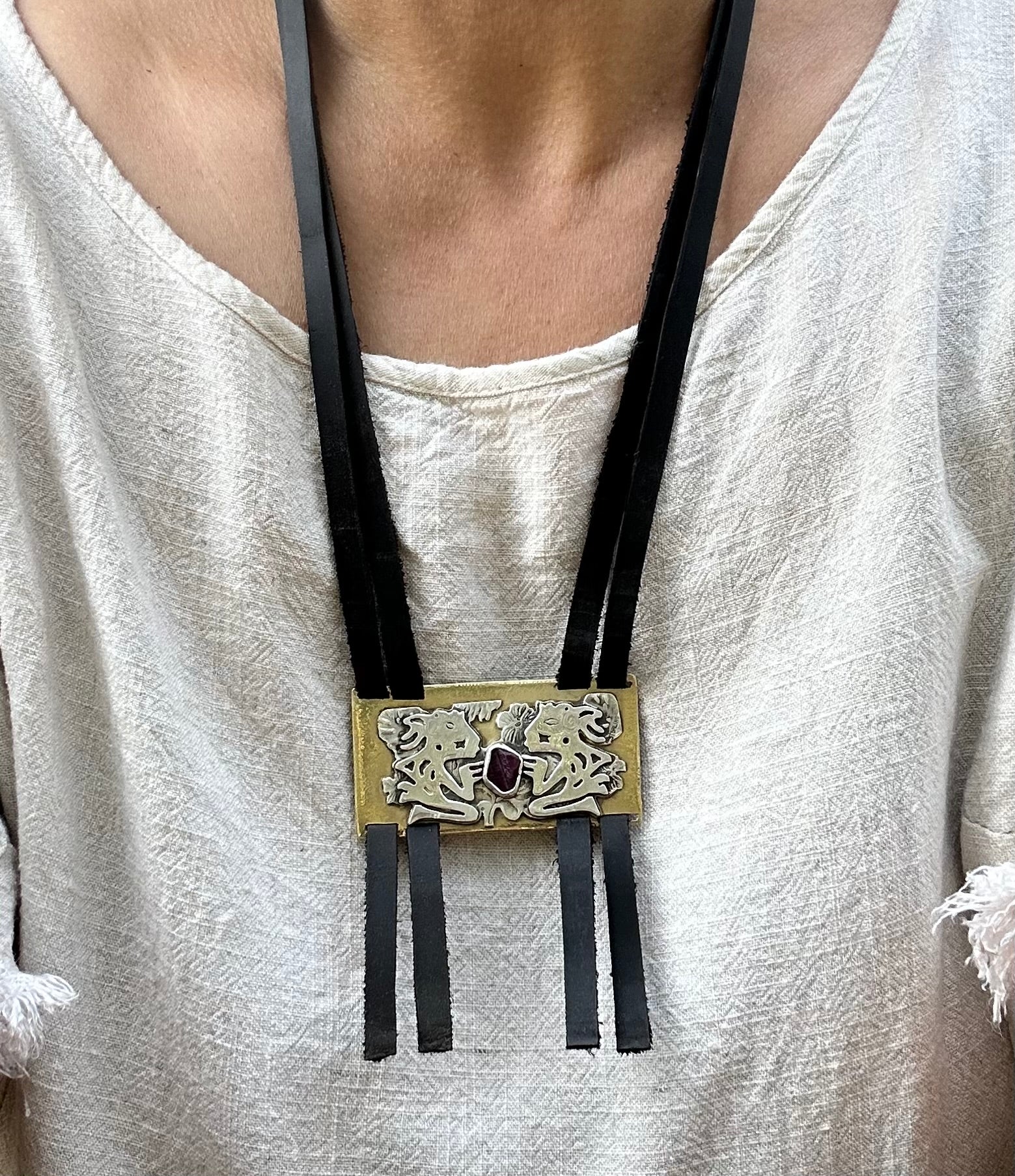 Sterling and fine silver, brass, genuine record keeper ruby and genuine leather.
